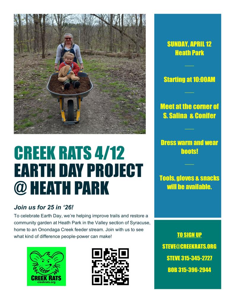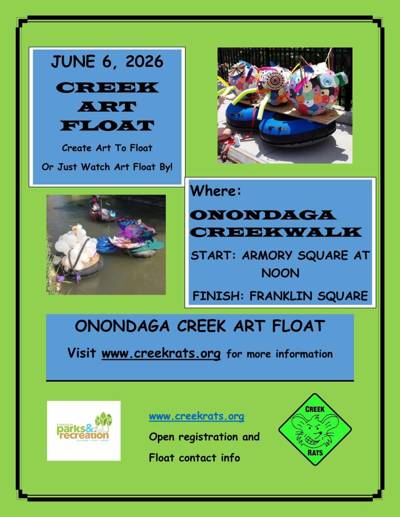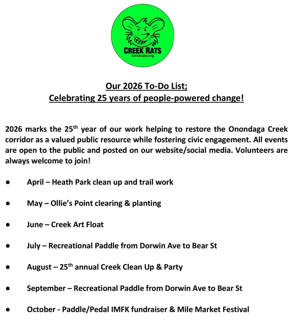 We kick off 2026 with a work day in Heath Park, an overlooked gem in the Valley section of Syracuse. Following that we return to the Ollie’s Point memorial greenspace area in Franklin Square to continue improving it. Then we switch gears to the Creek Art Float parade of floating art in partnership with the Syracuse Parks Department. followed by 2 summer recreational paddles down the Creek, our annual Creek work day, and capping off this 25th anniversary year with our 3rd Paddle/Pedal fundraiser for In My Father’s Kitchen at the Mile Market Festival. The public is always welcome at all our events and you can always contact us via email to volunteer.